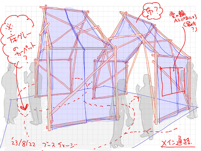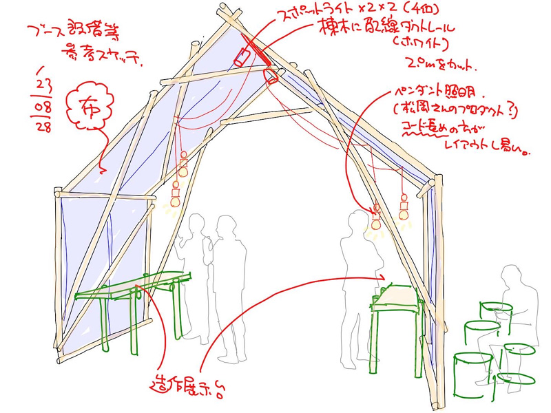 木材と布を使ったシンプルな構造。運搬、短時間での組み立て、解体を想定した仮設物としての構造と仕口。