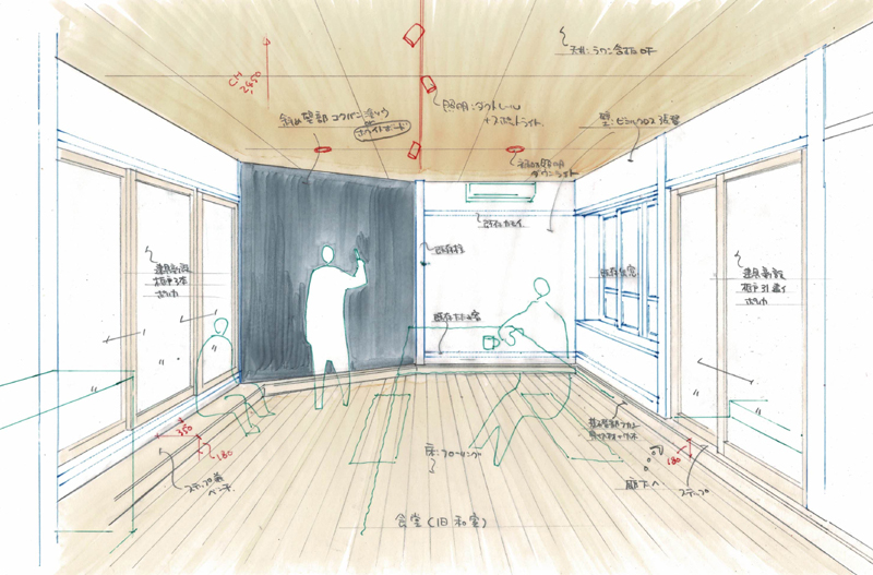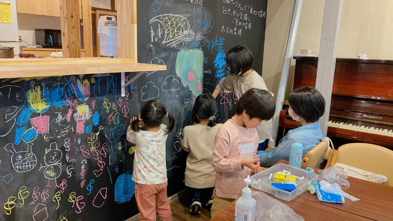交流スペースのキッチンに面した壁を黒板塗装に。