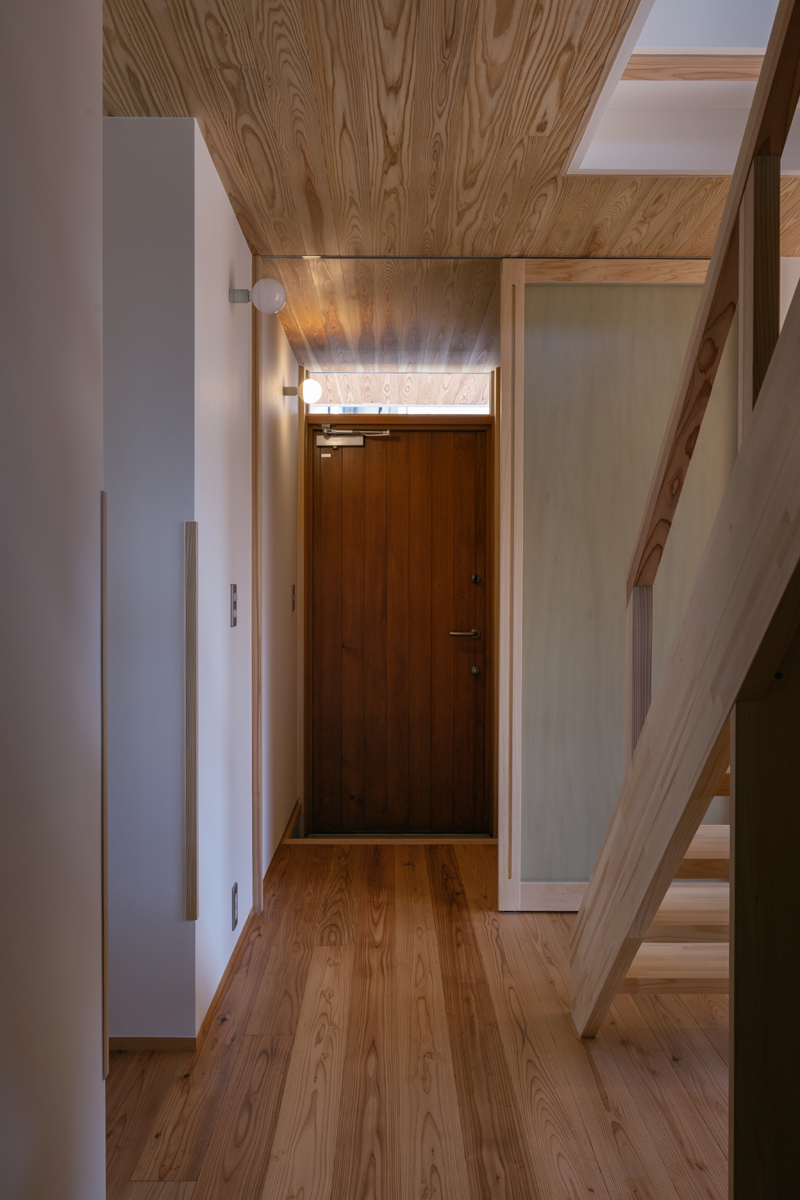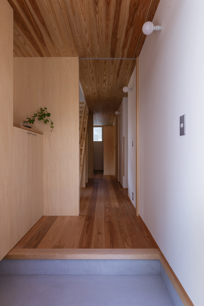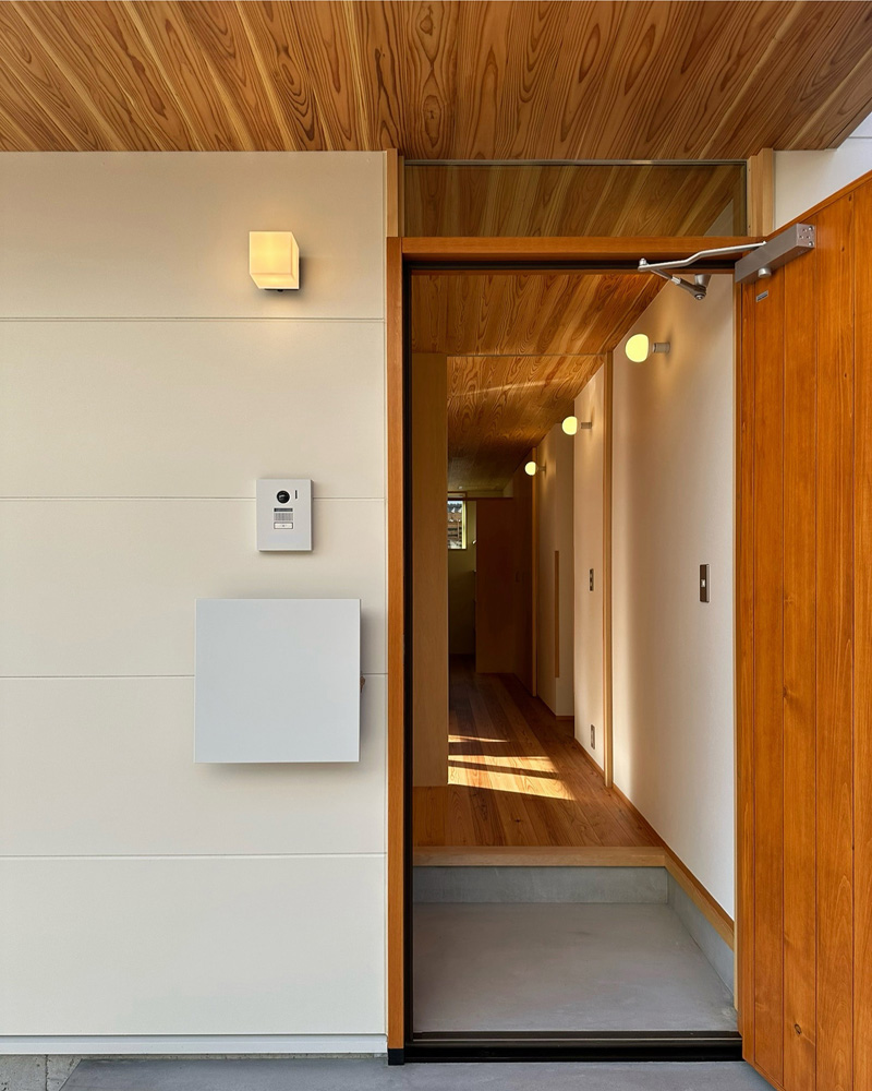コンパクトな玄関。天井と壁が連続して奥行きを生みます。