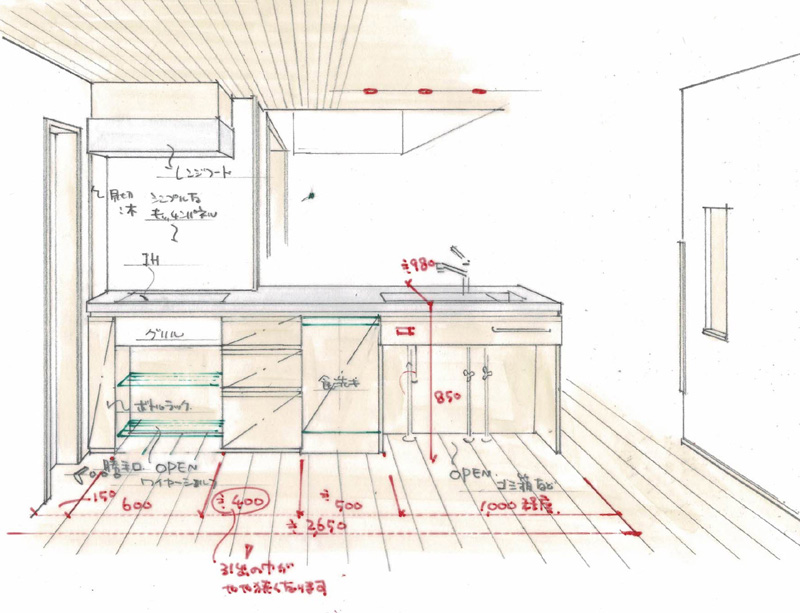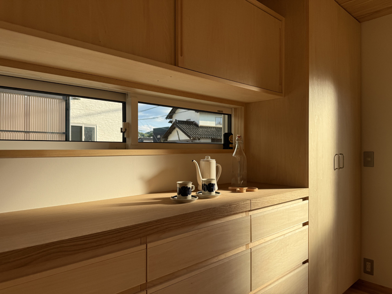 造り付け(家具工事)のキッチンとキッチン収納。メーカー品には無い建築との一体感がありますね。