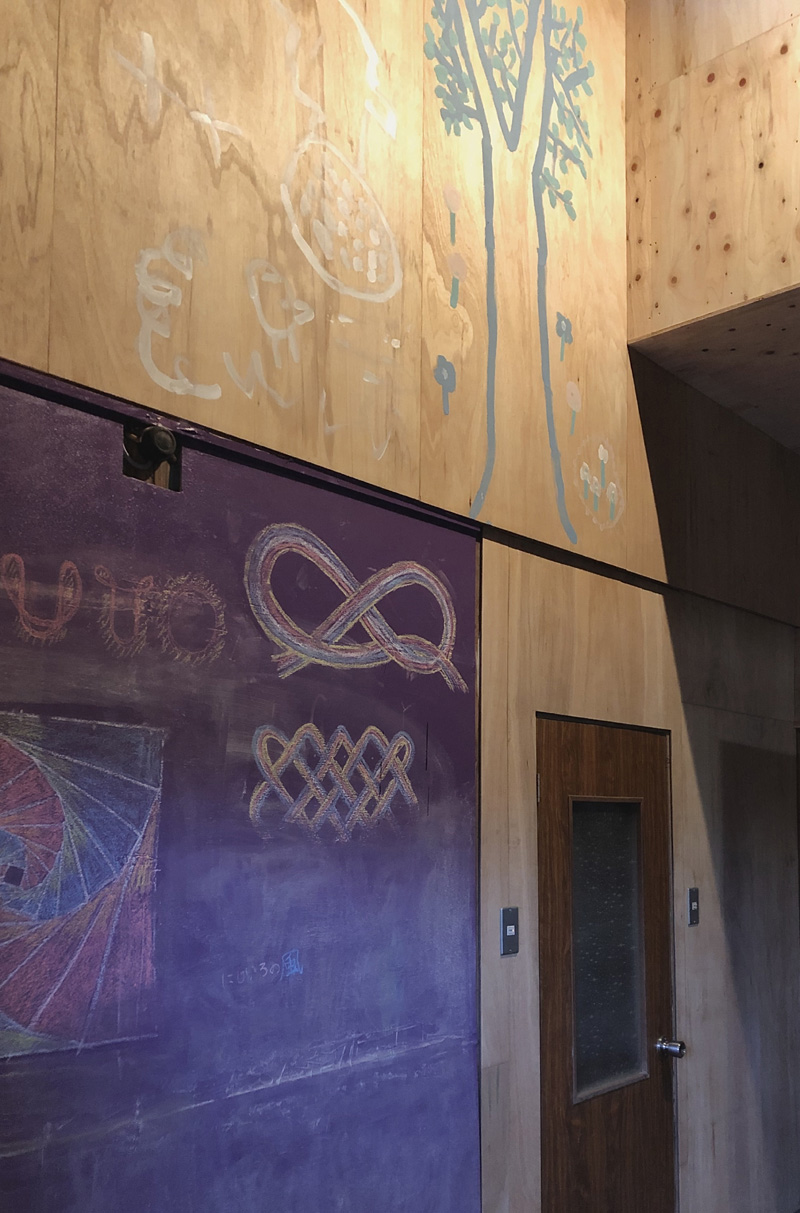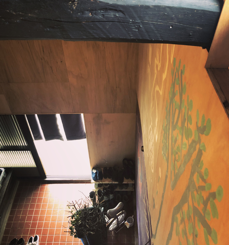 玄関の吹抜けにぐいっと力強い線で描かれた「壁画」。場を元気にしてくれました!