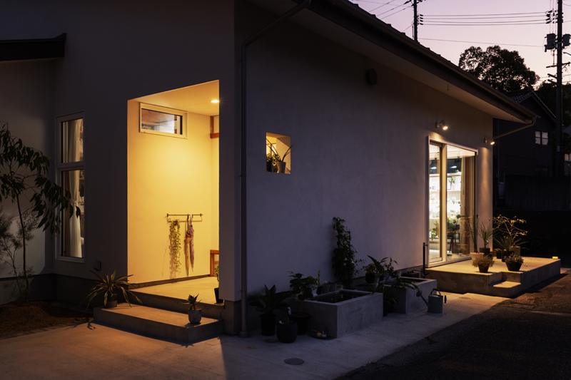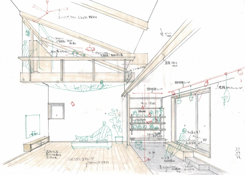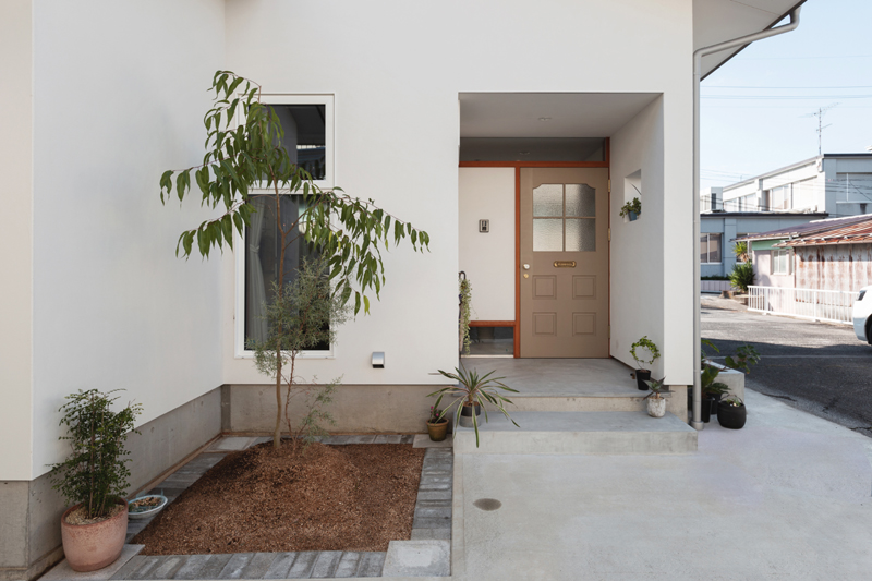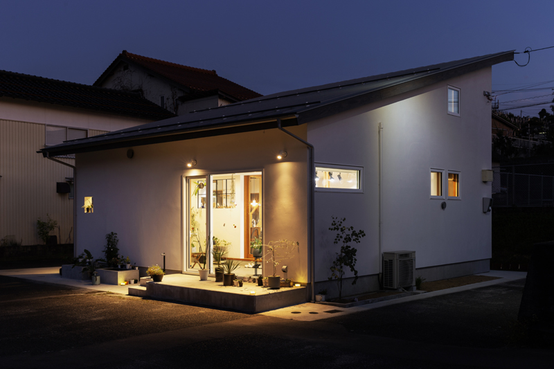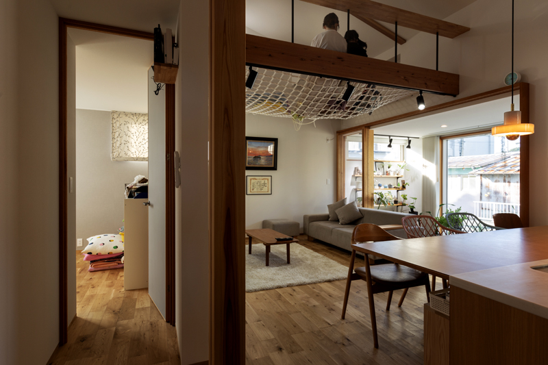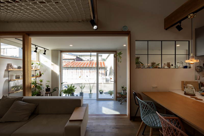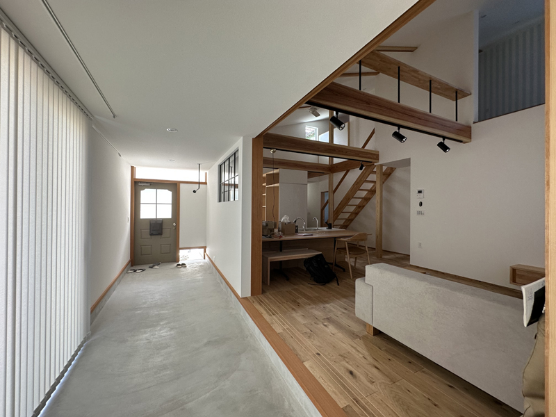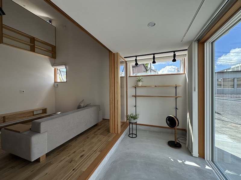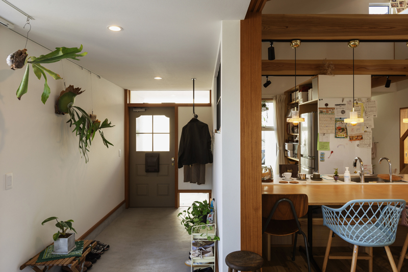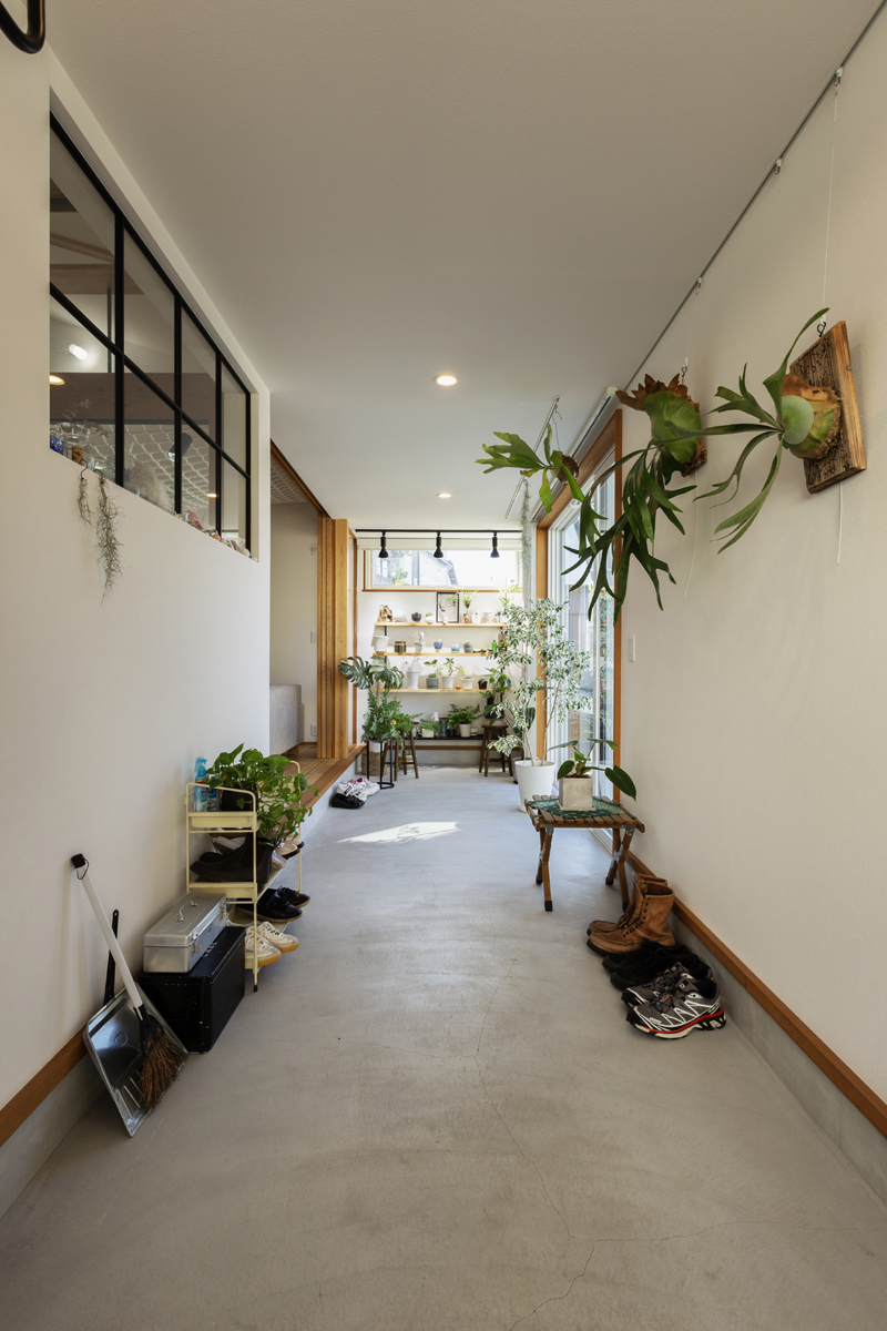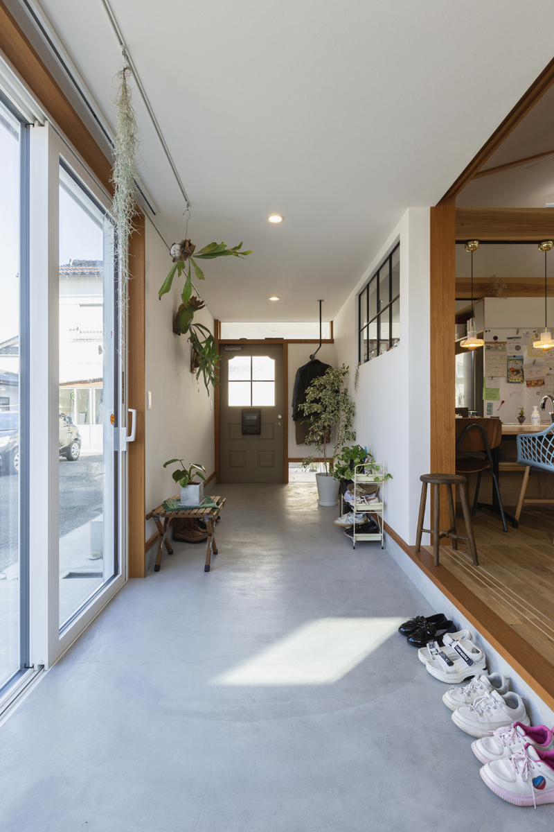 コンパクトな住宅のなかに趣味と日常の接点として玄関を兼ねた土間スペースが設けられました。大屋根のしたにひろがりと奥行きのある一室のような生活の場が出来上がりました。